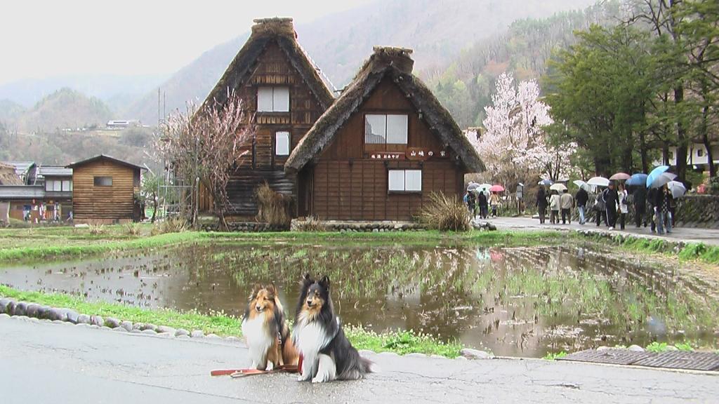 白川郷で小雨のラッキー、観光組みの2家族