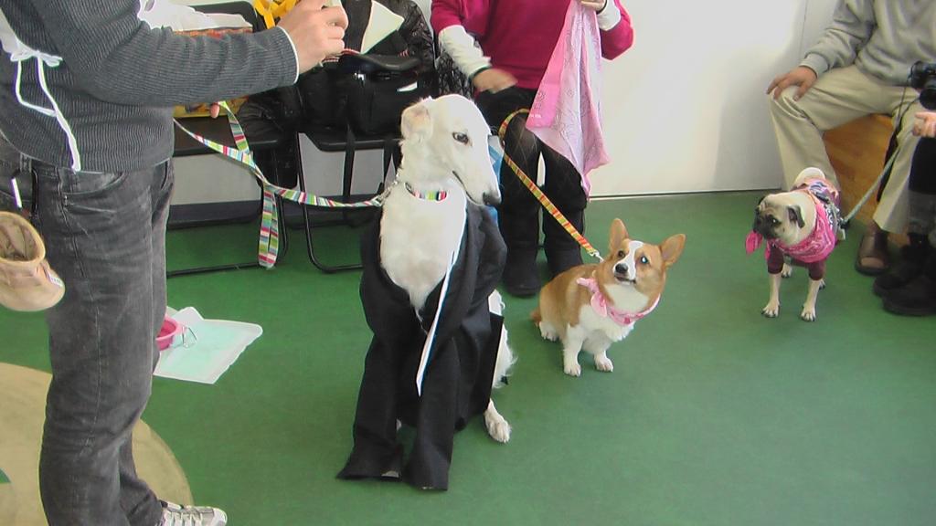 傍らには、先輩 ぱっぴぃちゃん(コーギー)、たつた君(パグ)
